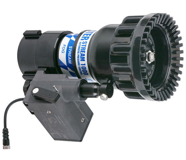 MASTER ELECTRIC REMOTE FIXED FLOW 2.5" NH (65mm) This nozzle, built on the Master Stream body, is a fixed constant flow nozzle. It is factory preset at the customer's specified K-factor 50 to 105 (1000 gpm (4000 l/min) max ). 2.5" NH (65 mm) rocker lug swivel coupling is standard. 3.0" NH (75mm) or 3.5" NH (90mm) coupling is optional. Flow and pressure are laser engraved on the baffle. For use on TFT RC monitors only.