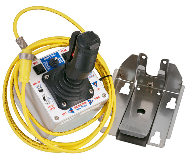 • The Panel Mount, Tethered and Wireless Operator Stations have a waterproof membrane switch to control vertical, horizontal, and nozzle patterns as well as the programmable PARK and Oscillate functions. Power, PARK and Oscillate indicator lights are standard. Two Auxiliary buttons are included and require the Remote Auxiliary Function Relay, Extend-A-Gun RC interface, or valve interface box to control lights, Extend-A-Gun RC, valve actuators, or other equipment. |