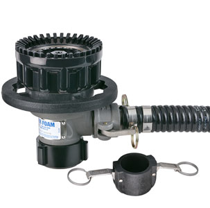 Self-Educting Foam Nozzle The Task Force Tips' MASTER FOAM nozzle is a simple and rugged self-educting foam nozzle with superior stream quality and reach. This fixed gallonage fog nozzle rated at 100 psi (7 bar) is available with your choice of 250, 350, 500 or 750 gpm (950, 1300, 2000, 3000 l/min). Fog angle is user adjustable between 90º wide fog and straight stream. The nozzle's baffle is easily removed for flushing debris. The standard swivel coupling is 2.5" NH, NPSH, or BSP (65 mm) female threads. The simple flow geometry can educt foam concentrate at .5%, 1%, 3%, or 6% with no small passages to clog. Percentage is easily set with an interchangeable orifice plate. A set of calibrated foam orifice plates is included. Nozzle comes with an industrial grade UV resistant, 10 feet long, 1.5" diameter (3m x 38 mm) concentrate hose with two cam lock fitting for quick and secure attachment to the nozzle. The simple and basic design requires no grease or other maintenance. The halo ring/stream shaper is made from non-corroding high temperature polymer. The rubber bumper is UV resistant. The MASTER FOAM self-educting nozzle is available in hardcoat anodized ANSI A356.0.T6 aluminum. All MASTER FOAM nozzles accept the FJ-LX-M FOAMJET low expansion air-aspirating attachment.