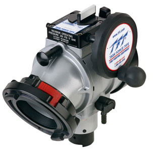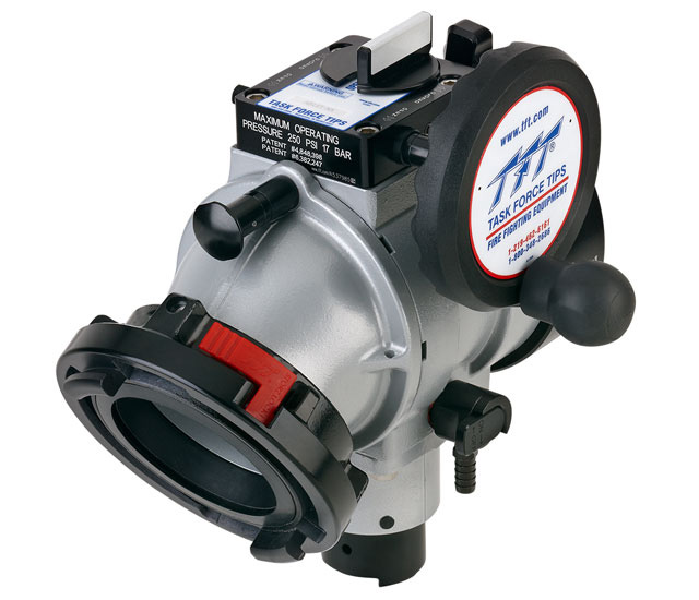 BALL INTAKE VALVE AB Series - BIV - TFT's Ball Intake Valve has a 3.65" waterway and is designed for use with 3.5, 4, 4.5, 5 or 6" (90, 100, 114, 125 or 150 mm) hose. The 30° intake elbow swivels 360° and has multiple positive detents. Make hose connections from any direction with minimal kinks and coupling stress. Designed for pressure or vacuum service on a pumper. Maximum operating pressure is 300 psi (20 bar). Meets 900 psi (62 bar) hydrostatic strength test. The aluminum castings are hard coat anodized, and TFT-powder coat finished inside and out for maximum corrosion protection. All the components on the wet side of the valve are made of stainless steel for additional corrosion protection. The hand wheel needs 7-1/2 turns to open, meeting NFPA slow close requirements. There is a unique position indicator that shows the operator if the valve is open, closed or somewhere in between. The hand wheel is installed on the right side of the valve, but can be switched to the left side if desired. The unit comes equipped with a rugged ¾" (19mm) drain valve to quickly drain water from the valve housing. A port for an optional air bleed valve is incorporated into the design for user friendly configurability. Hose couplings and truck connections are attached to the valve using polymer bearing rings which provide electrical isolation to help prevent galvanic corrosion. Includes TFT's new adjustable pressure relief valve with a discharge that can be directed one of four ways and meets NFPA 1900. Contact TFT customer service for configurations not shown. Cap lanyard anchor point is standard.