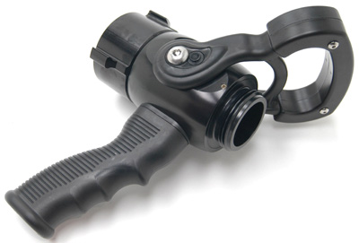 Separate ball-type shutoff valve with a 1-3/8" (35 mm) waterway and a built-in pistol grip mounted below the valve body for use with tip only nozzles. Six detent flow positions, optional colored pistol grip and handle covers, 1.5" (38 mm) NH rocker lug full-time swivel coupling, and 1.5" (38 mm) NH male outlet standard. All lightweight materials. Accepts F140SBI smooth bore insert kit found on page 13.