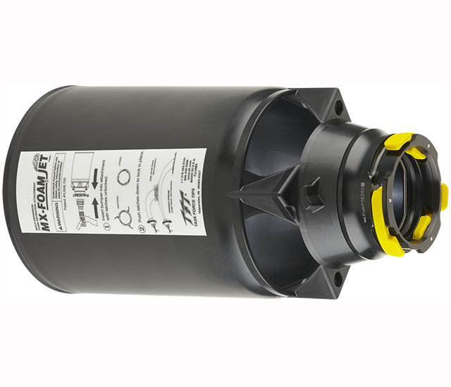 MX-FOAMJET - THUNDERFOG Air-aspirating foam-making attachment for all 1.5" & 2.5" (38 mm & 65 mm) ThunderFog nozzles. Flow range of 30-250 gpm (110-1100 l/min) matches that of corresponding 1.5" & 2.5" (38 mm & 65 mm) ThunderFog nozzle (needed for operation). The MX-FOAMJET is constructed of durable UV stabilized polyethylene and aluminum. Diameter 8.6" (21.8cm). NOTE: Will not fit fixed teeth models manufactured prior to 5/97 without bumper upgrade. (Free upgrade with purchase of FJ-MX-FT).