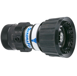 • The Quadrafog Series of selectable gallonage 1 in and 1.5 in nozzles are designed for simple operation and rugged durability in wildland or structural firefighting operations. Available in tip only configurations or with a stainless steel ball shutoff and optional color coded nylon pistol grip, these series incorporate lightweight aluminum construction, reflective labeling, and stainless steel components with a protective front rubber bumper. |