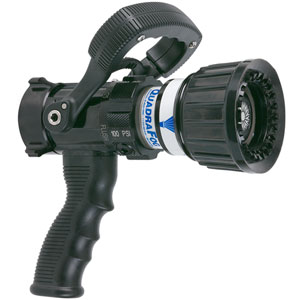 • The Quadrafog Series of selectable gallonage 1 in and 1.5 in nozzles are designed for simple operation and rugged durability in wildland or structural firefighting operations. Available in tip only configurations or with a stainless steel ball shutoff and optional color coded nylon pistol grip, these series incorporate lightweight aluminum construction, reflective labeling, and stainless steel components with a protective front rubber bumper. |