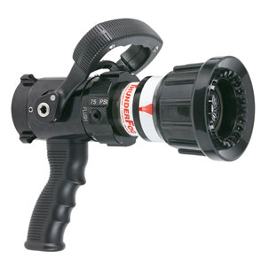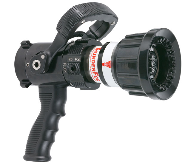 •   The Thunderfog Series of selectable gallonage 1½” and 2½” nozzles are designed for simple operation and rugged durability in structural and industrial firefighting operations. Available in tip only configurations or with a stainless steel ball shutoff and optional color coded nylon pistol grip, these series incorporate lightweight aluminum construction, reflective labeling, and stainless steel components with a protective front rubber bumper.