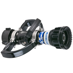 • The full size Handline nozzle is available with 100, 75, or 55 psi operational pressure to meet any fire ground operational challenge. The high strength bonded rubber fog teeth provide a full filled pattern that pushes heat flame and smoke ahead and away from the firefighting team. |