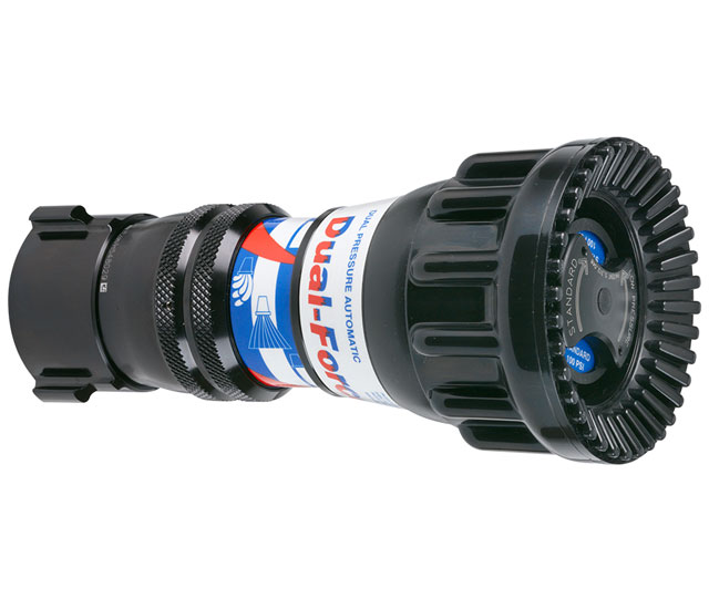 •   The full size Dual Force Handline nozzle is available with 100/55psi or 75/45psi operational pressure choices to meet any fire ground operational challenge. The high strength bonded rubber fog teeth provide a full filled pattern that pushes heat flame and smoke ahead and away from the firefighting team.