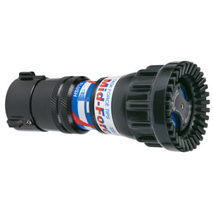 LOW PRESSURE VERSION.  The Mid-Force™ Automatic Nozzle series provides firefighting crews with dual-pressure functionality, enabling a choice between standard and low-pressure modes. Designed for aggressive departments, this nozzle delivers a flow range of 70-200 GPM (265-760 LPM) and is compatible with various hose sizes and connections. With options for molded rubber or stainless-steel spinning teeth, these nozzles are ideal for creating straight streams to dense fog patterns for comprehensive coverage.