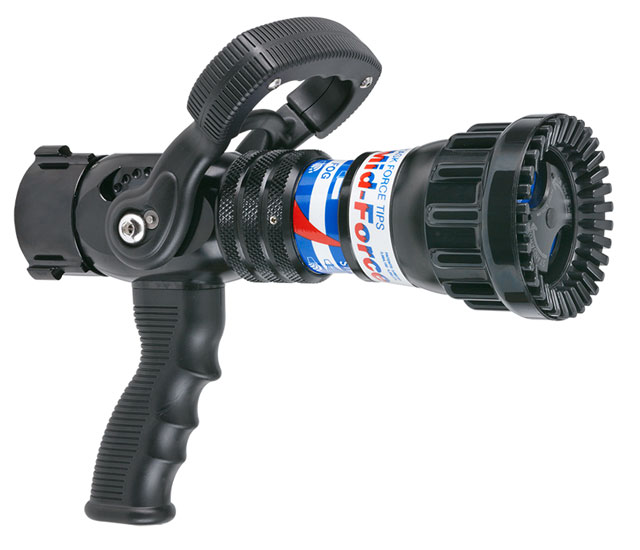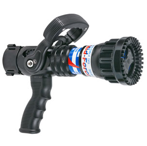 LOW PRESSURE VERSION. The Mid-Force™ Automatic Nozzle series provides firefighting crews with dual-pressure functionality, enabling a choice between standard and low-pressure modes. Designed for aggressive departments, this nozzle delivers a flow range of 70-200 GPM (265-760 LPM) and is compatible with various hose sizes and connections. With options for molded rubber or stainless-steel spinning teeth, these nozzles are ideal for creating straight streams to dense fog patterns for comprehensive coverage.