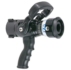 Separate ball-type shutoff valve with built-in pistol grip mounted below valve body for use with tip only nozzles. Use the valve as a smooth bore at the selected outlet diameter. Six detent flow positions. Colored pistol grip and handle covers available. 1.5" NH (38 mm) rocker lug full-time swivel inlet coupling and 1.5" NH (38 mm) male outlet standard. All lightweight materials are used.