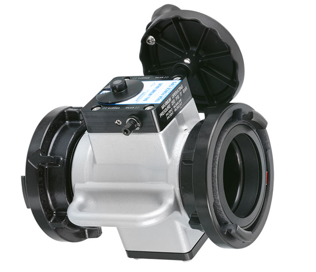 IN-LINE VALVE WITH STANDARD GEARBOX TFT's In-Line Valve is a multi-purpose valve designed for use with 3.5, 4, 4.5 or 5 inch (90, 100, 114, 125 or 150 mm) hose. Maximum operating pressure is 250 psi (17bar). Meets 900psi (62 bar) hydrostatic strength test. The aluminum casting are Hardcoat anodized, and powder coat finished inside and out for maximum corrosion protection. The valve meets NPFA slow close requirements. Optional adjustable pressure relief valve meets NFPA 1900. Optional rugged ¾" (19 mm) air bleed valve quickly bleeds air from the lines or drains water from the valve housing. Contact TFT customer service for configurations not shown.