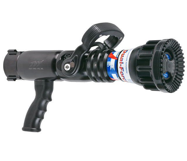 • The full size Dual Force Handline nozzle is available with 100/55psi or 75/45psi operational pressure choices to meet any fire ground operational challenge. The high strength bonded rubber fog teeth provide a full filled pattern that pushes heat flame and smoke ahead and away from the firefighting team. |