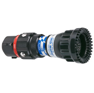 • The Mid-Matic handline nozzle is available with 100, 75 or 55psi operational pressure choices to meet any fire ground operational challenge. All models are available with your choice of high strength bonded rubber fog teeth which provide a full filled pattern, or the wide protective pattern of TFT’s unique stainless steel spinning teeth design. |