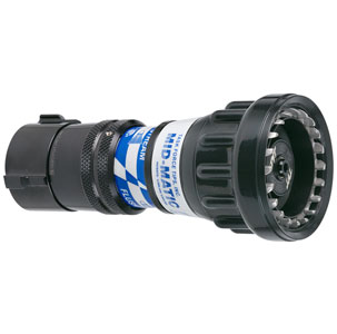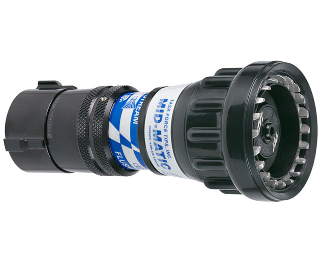 MID-MATIC TIP 100 PSI 1.5" NH (38mm) The Mid-Matic™ Automatic Nozzle is designed for firefighting teams requiring mid-range flow and flexible pressure options. Delivering between 25-200 GPM (100-750 LPM), the Mid-Matic™ provides efficient water application with easy customization. Built to meet NFPA standards, it features a patented slide valve, detent flow control, and is available with various grip and coupling options for enhanced handling on the fireground.