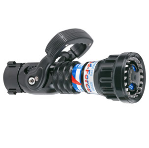 • The Mid-Force handline nozzle is available with 100/55 or 75/45psi dual operational pressure choices to meet any fire ground operational challenge. All models are available with your choice of high strength bonded rubber fog teeth which provide a full filled pattern, or the wide protective pattern of TFT’s unique stainless steel spinning teeth design. |