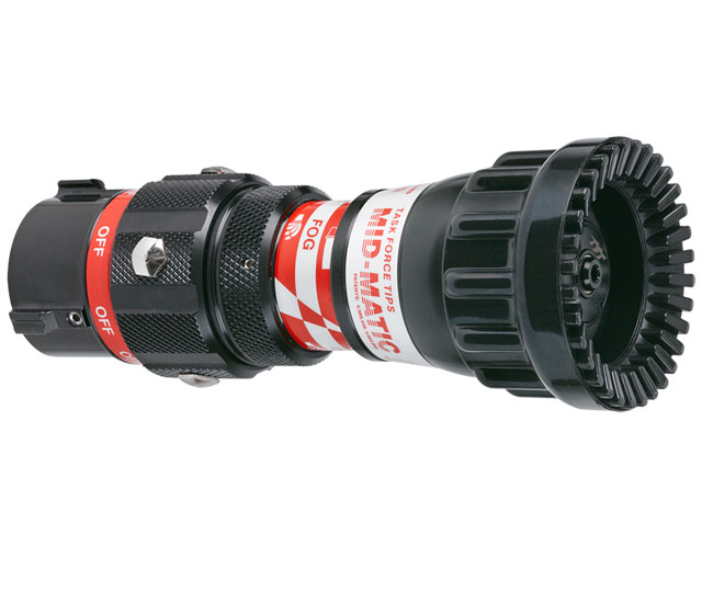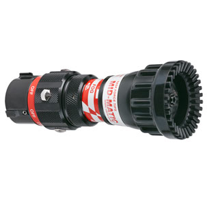 • The Mid-Matic handline nozzle is available with 100, 75 or 55psi operational pressure choices to meet any fire ground operational challenge. All models are available with your choice of high strength bonded rubber fog teeth which provide a full filled pattern, or the wide protective pattern of TFT’s unique stainless steel spinning teeth design. |