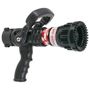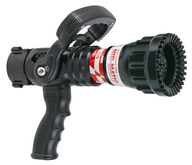 • The Mid-Matic handline nozzle is available with 100, 75 or 55psi operational pressure choices to meet any fire ground operational challenge. All models are available with your choice of high strength bonded rubber fog teeth which provide a full filled pattern, or the wide protective pattern of TFT’s unique stainless steel spinning teeth design. |