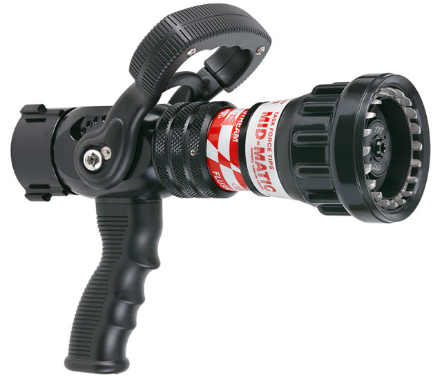 • The Mid-Matic handline nozzle is available with 100, 75 or 55psi operational pressure choices to meet any fire ground operational challenge. All models are available with your choice of high strength bonded rubber fog teeth which provide a full filled pattern, or the wide protective pattern of TFT’s unique stainless steel spinning teeth design. |