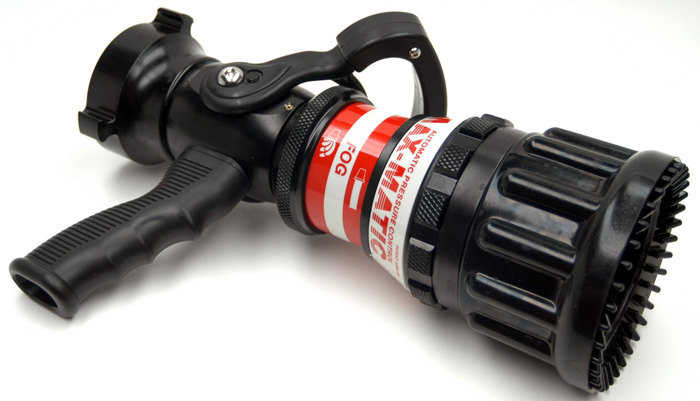 • The Max Series Handline nozzles are available with 100/55psi dual pressure, or 100 or 80 psi pressure choices to meet any fire ground operational challenge. The high strength bonded rubber fog teeth provide a full filled pattern that pushes heat flame and smoke ahead and away from the firefighting team. |